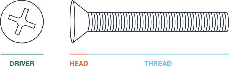 The anatomy of a screw can be broken down into 3 parts: driver, head and thread