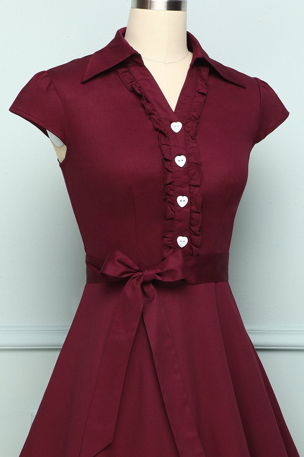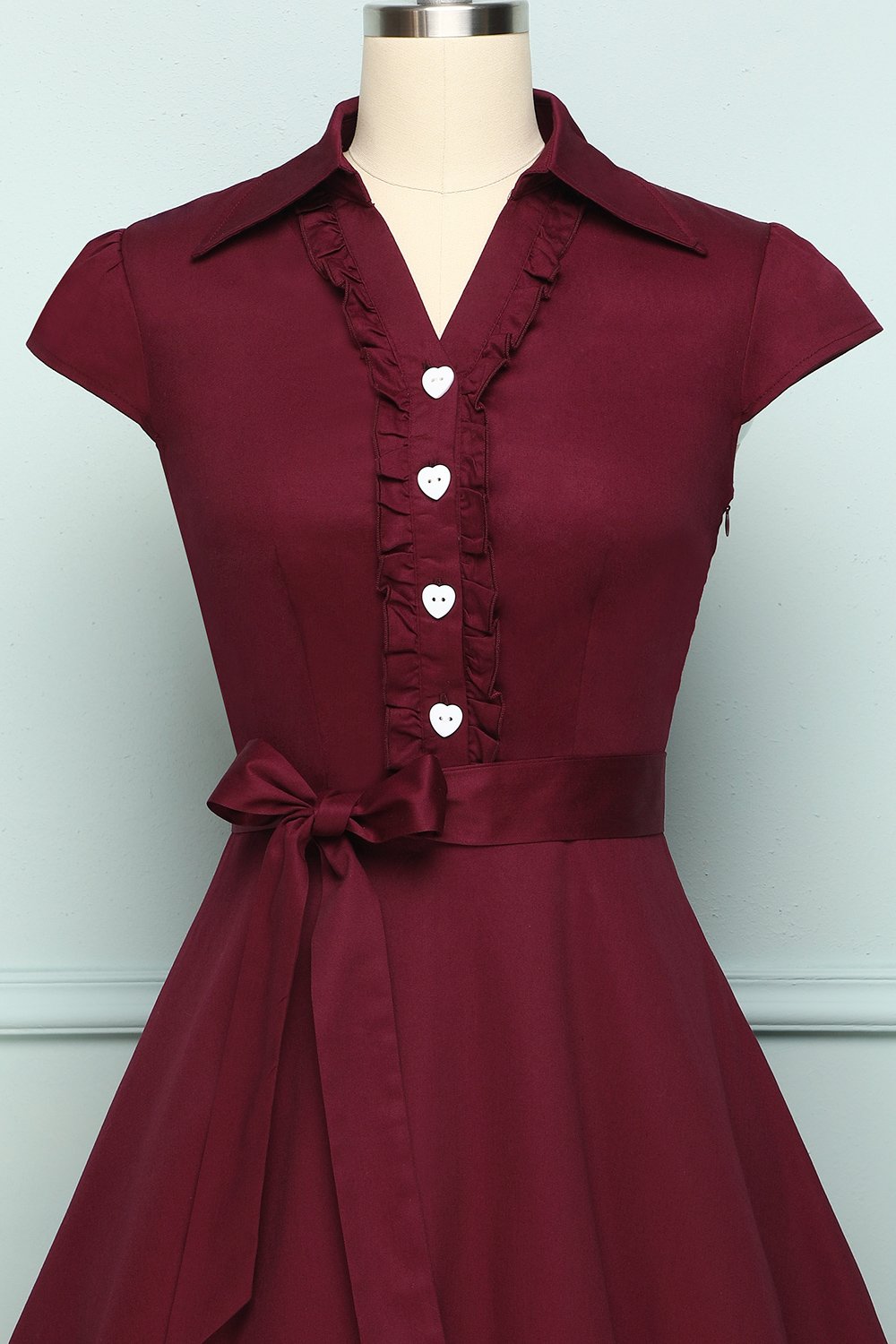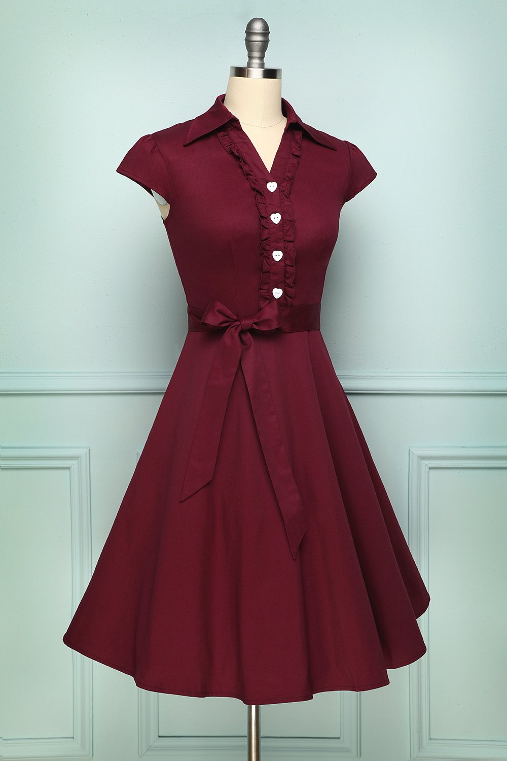 An A-line burgundy dress designed with wing collar combined with V-neck cut is for a semi-casual look. The buttons are hearted shaped to elevate feminine touch along with an embellishment of frills on the center. An attachable ribbon along the waist can be worn. The 1950s vintage dress is a combination of semi-formal and feminine style. Also, we haven't even told you the best part: the sash isn't sewn onto the vintage party dress, so you can choose whether to put it on or not.