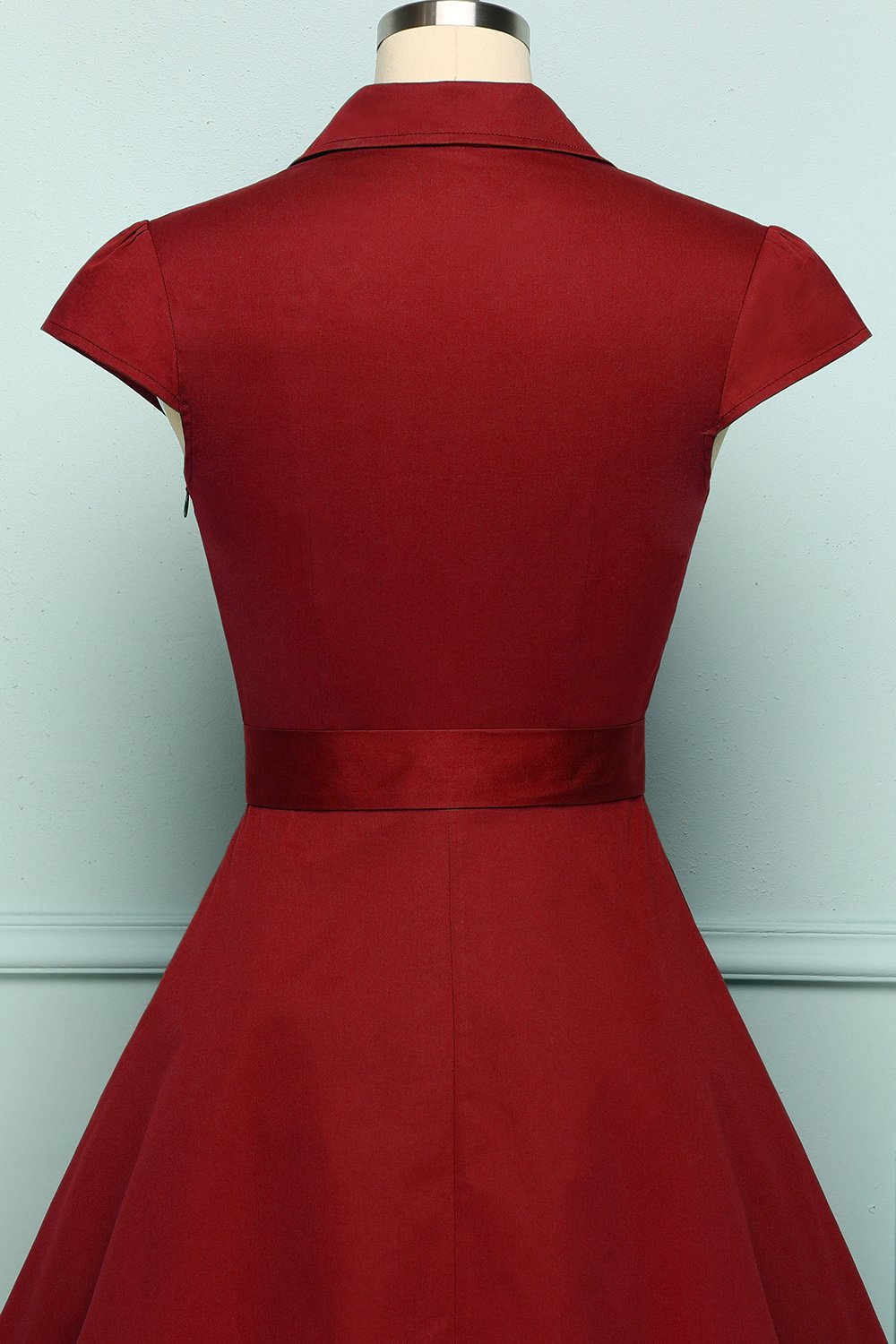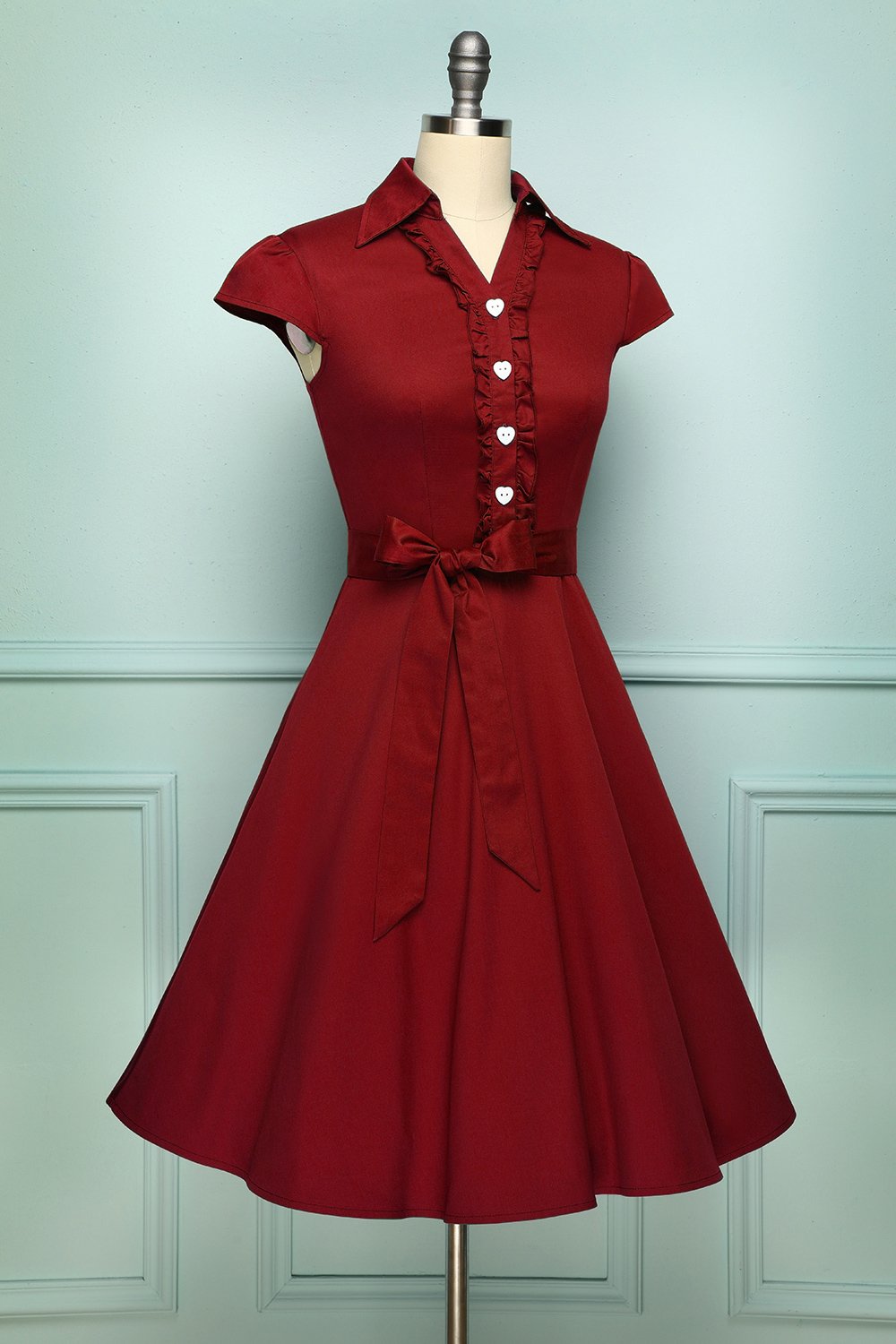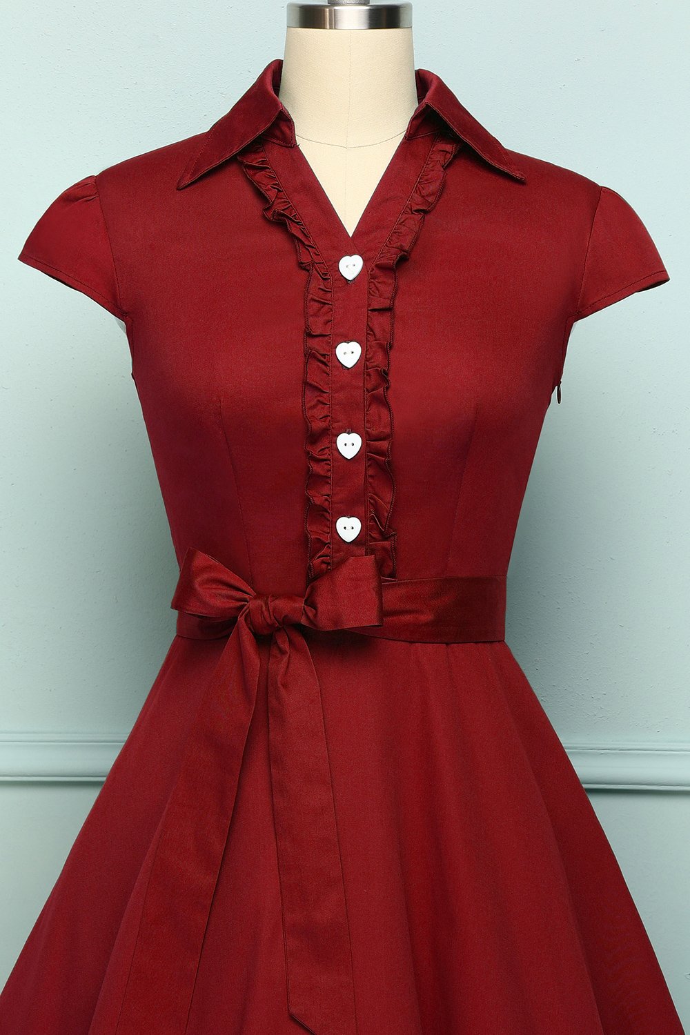 An A-line dark red dress for a semi-casual look. The top part is designed with swing collar combined with V-neck cut. The buttons are hearted shaped to elevate feminine touch along with an embellishment of frills on the center. An attachable ribbon along the waist can be worn. The vintage swing dress is a combination of semi-formal and feminine style. In addition, we haven't even told you the best part: the sash isn't sewn onto the dress, so you can choose whether to put it on or not.