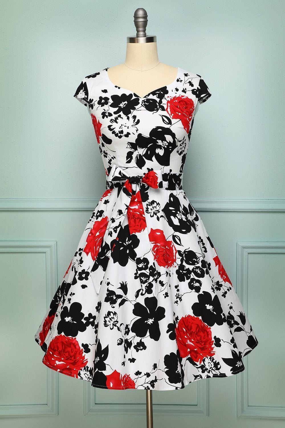 An A-line vintage dress made with floral pattern of black and red hues is for a bold and classy effect. The v-neck neckline, with a backless look corset zipper up, will accentuate the bosom. An attachable bow made of satin on the waist adds flare to the vintage floral dress. A flared-out skirt fitted around the waist is for a classic chic style. In addition, we haven't even told you the best part: the sash isn't sewn onto the vintage inspired dress, so you can choose whether to put it on or not.