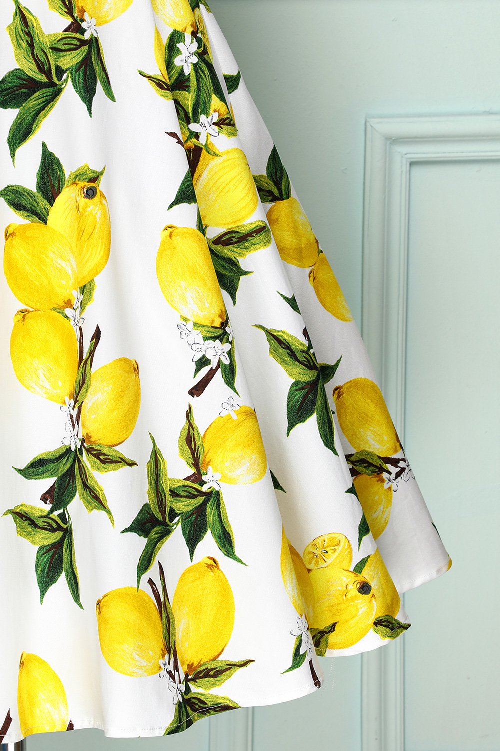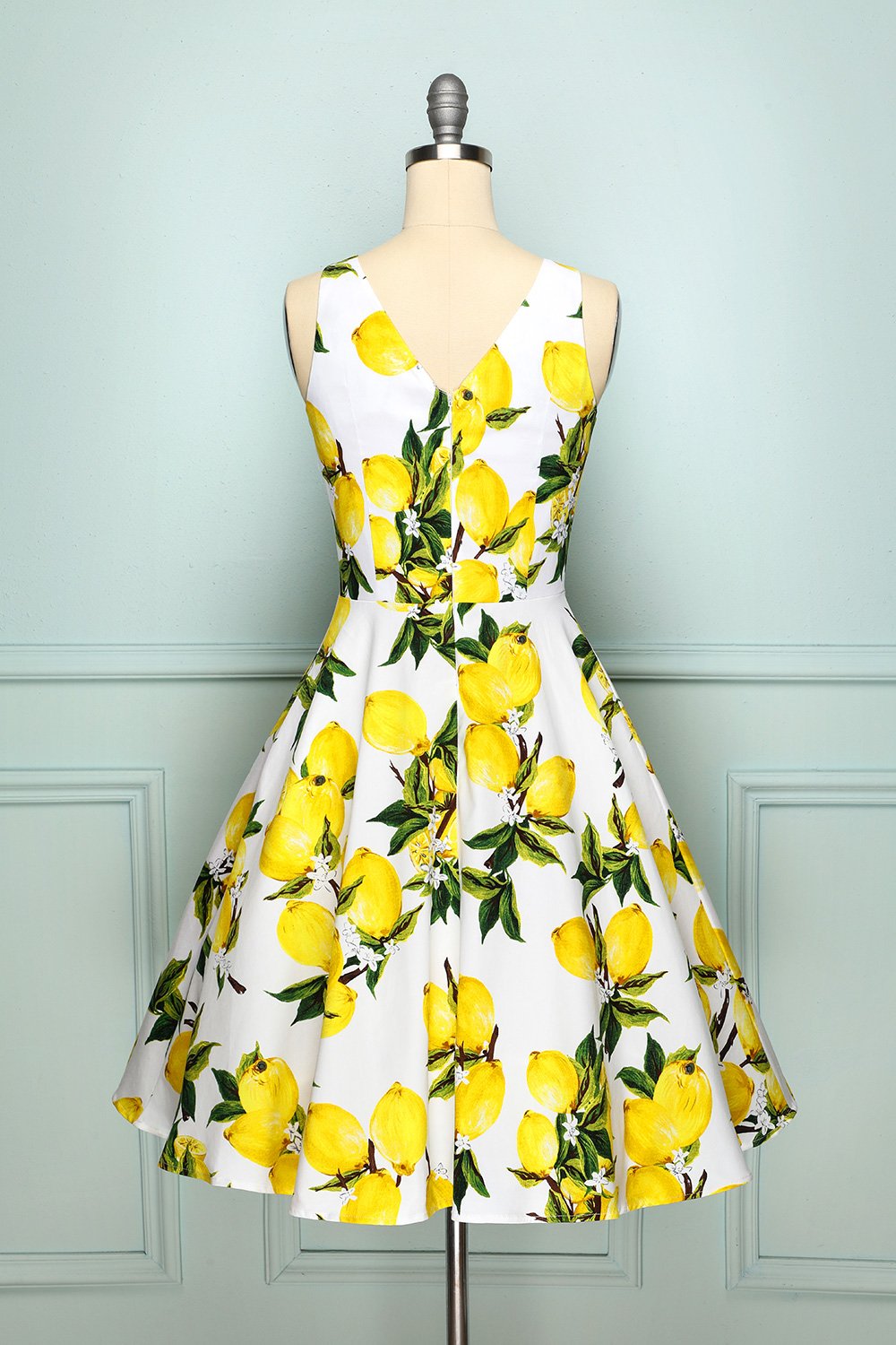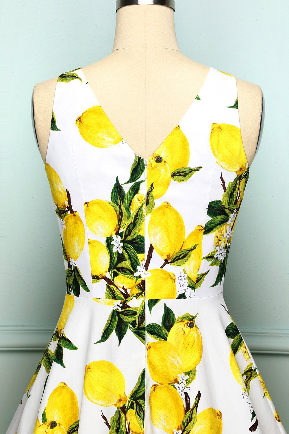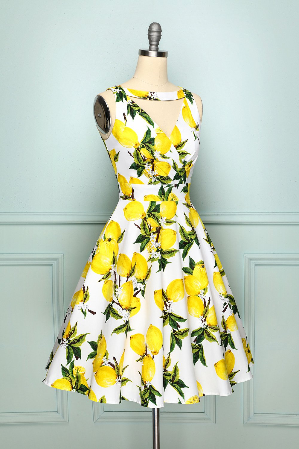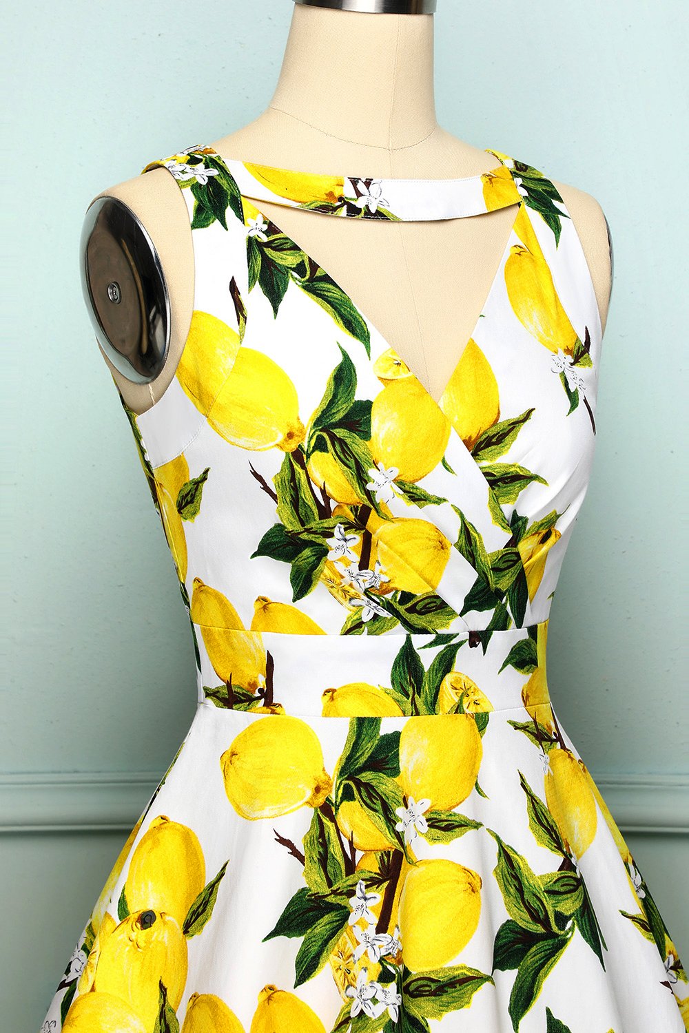 What a cute lemon print dress, a perfect match for summer! Cast in a fabulous cotton stretch and boasting a lemon print which is highlighted by a soft white backdrop. With a sweet sleeveless design, the bodice is darted to help shape and define your figure, while deep knife pleats add a bit of volume to the flared skirt, which comes to a straight hem at your knees. This dress has V-neck neckline both in front and back, the most eye-catching part is a gathered surplice v-neckline with unique choker design. It's time to add this show-stopper to your shopping cart!