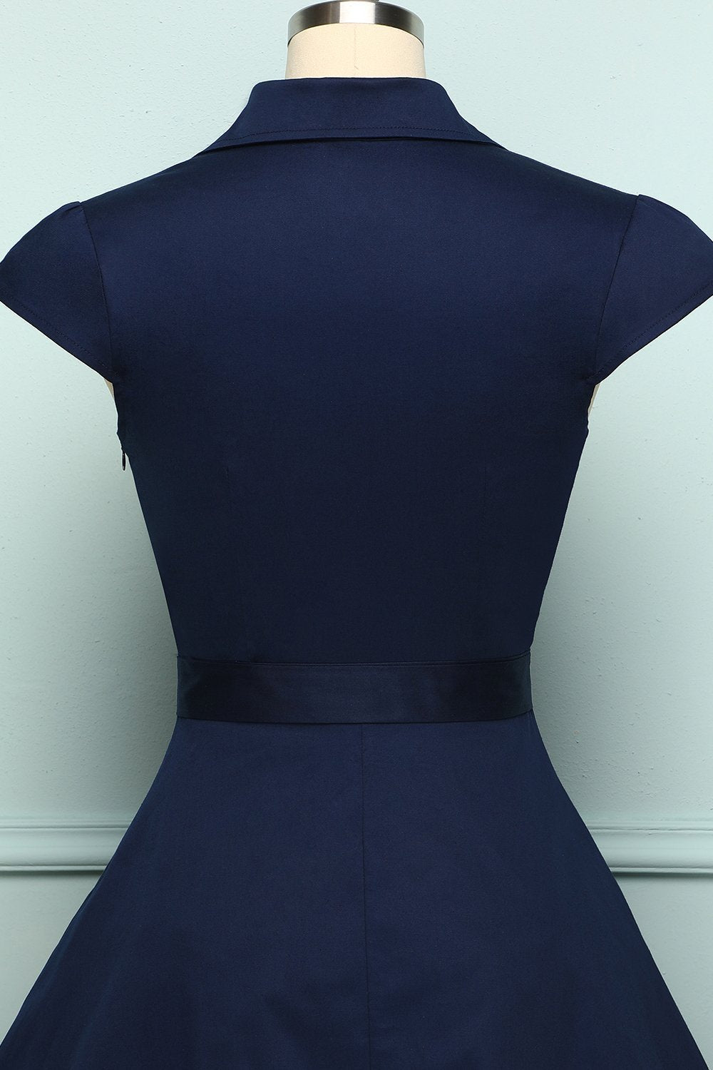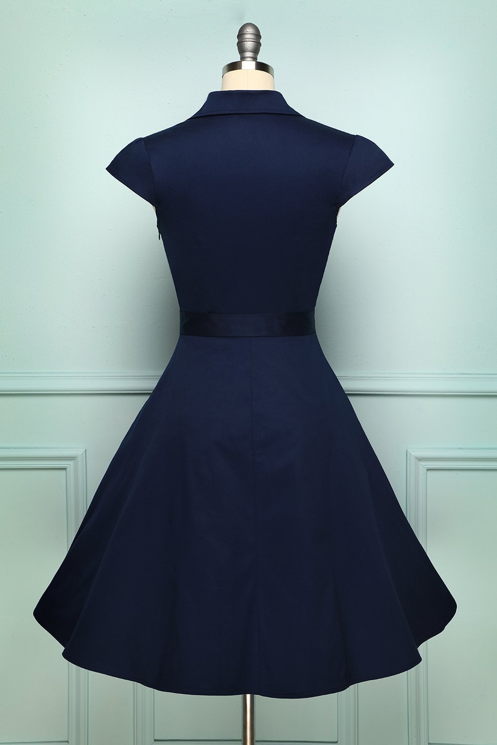 An A-line navy dress designed with wing collar combined with V-neck cut is for a semi-casual look. The buttons are hearted shaped to elevate feminine touch along with an embellishment of frills on the center. An attachable ribbon along the waist can be worn. The 1950s vintage dress is a combination of semi-formal and feminine style. Also, we haven't even told you the best part: the sash isn't sewn onto the navy blue dress, so you can choose whether to put it on or not.
