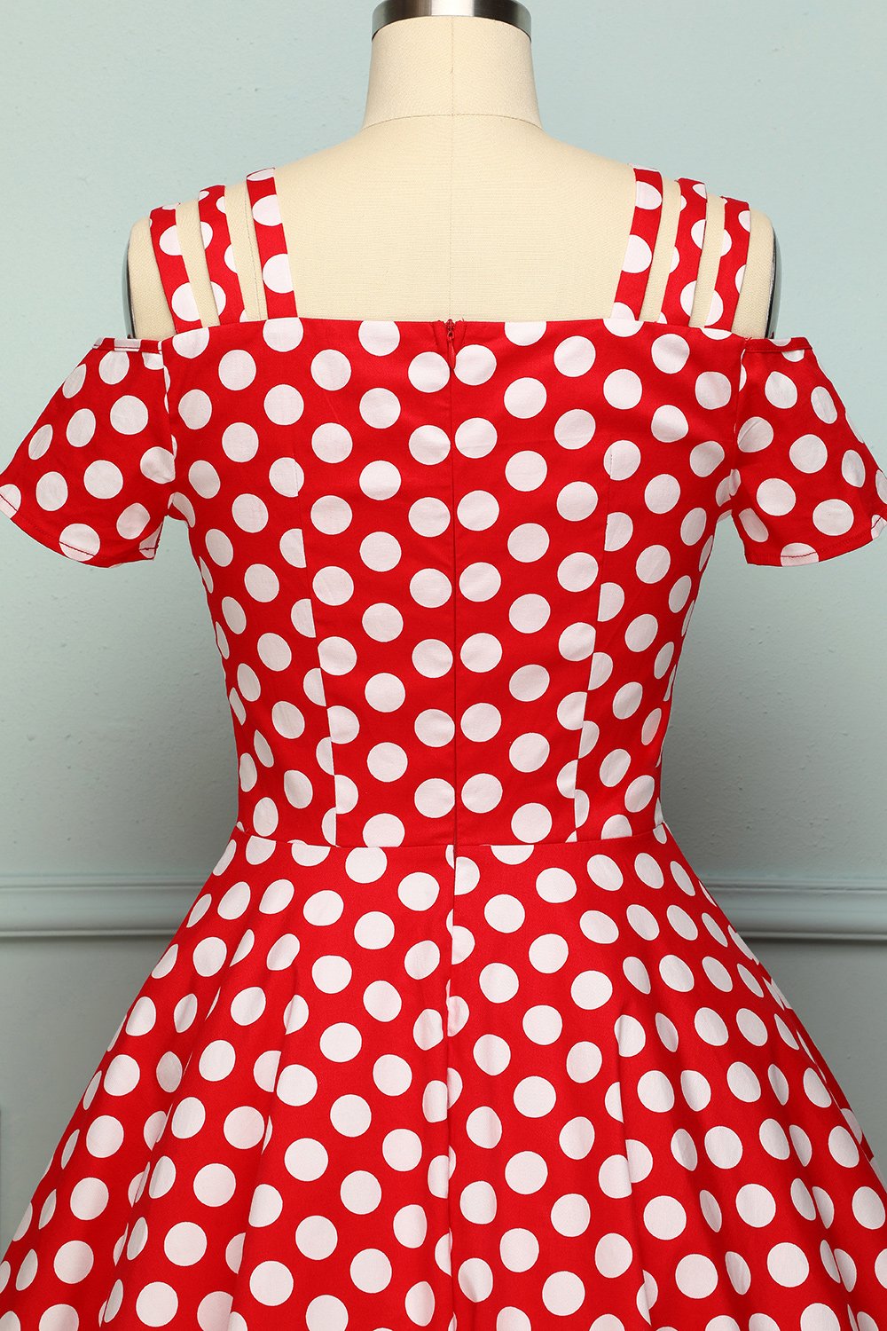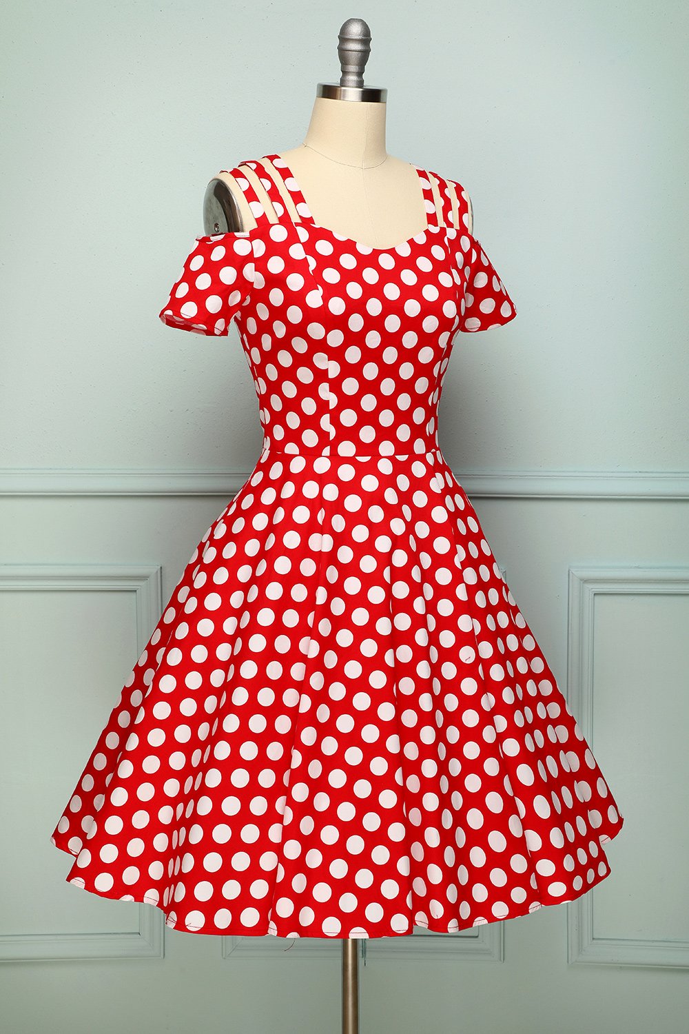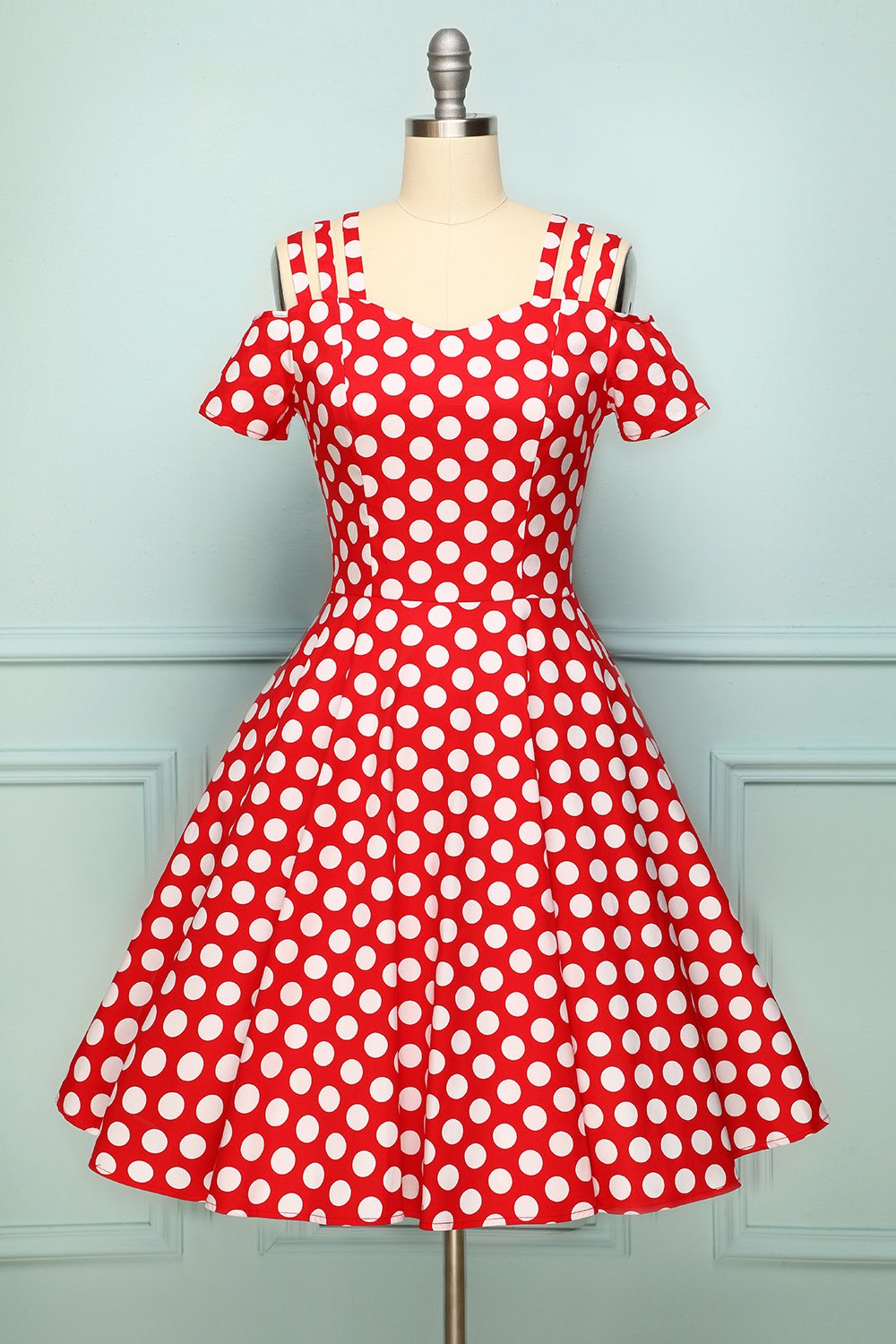 Inspired from the retro 1950s swing dress, a red vintage dress with white polka dot pattern is perfect for a casual summer look. The neckline is an off-shoulder cut with three straps for a modern touch. A form fitting bodice emphasizes the shape of the body. A flared-out skirt is comfortable to wear all day long.