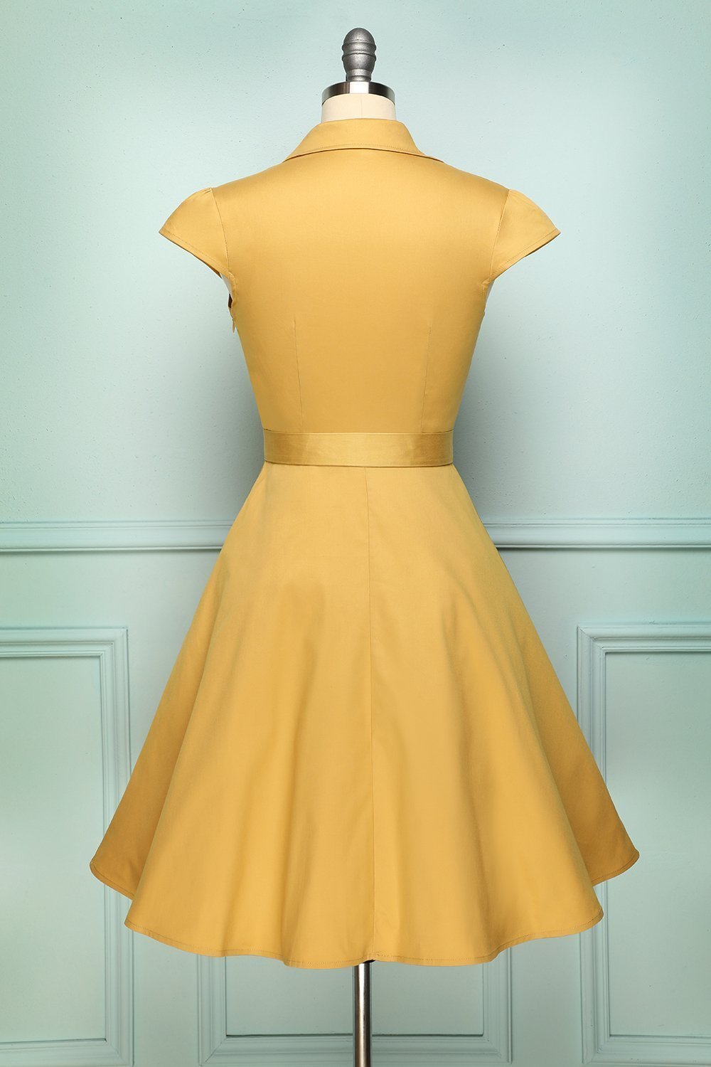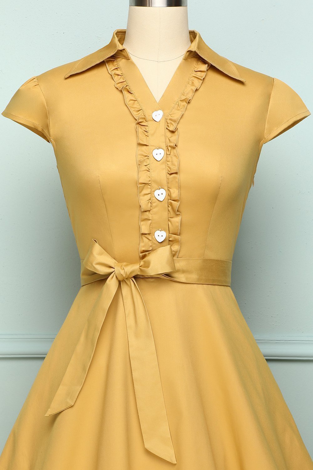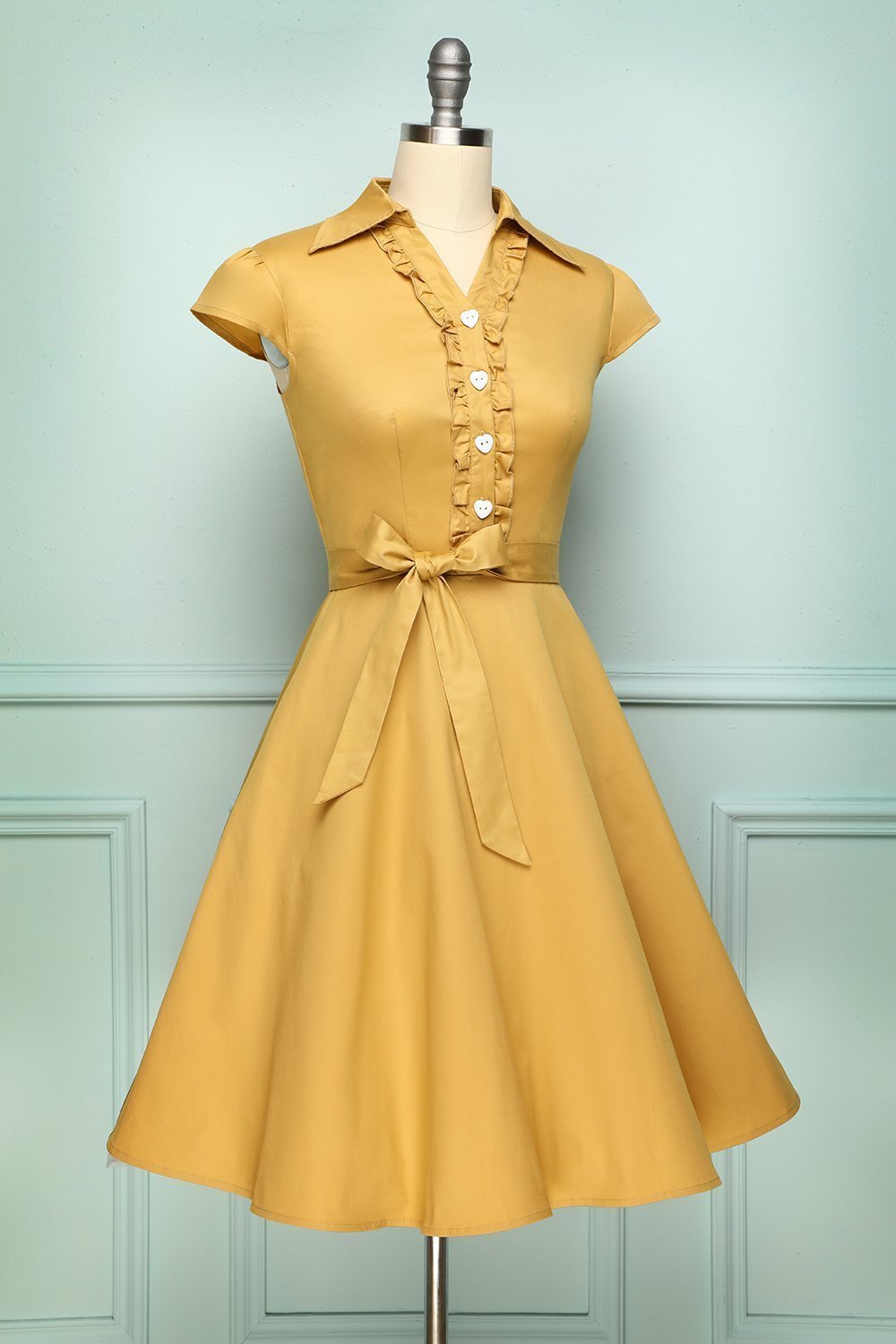 An A-line turmeric dress is for a semi-casual look. The top part is designed with wing collar combined with V-neck cut. The buttons are hearted shaped to elevate feminine touch along with an embellishment of frills on the center. An attachable ribbon along the waist can be worn. The 1950s swing dress is a combination of semi-formal and feminine style. Also, we haven't even told you the best part: the sash isn't sewn onto the vintage inspired dress, so you can choose whether to put it on or not.