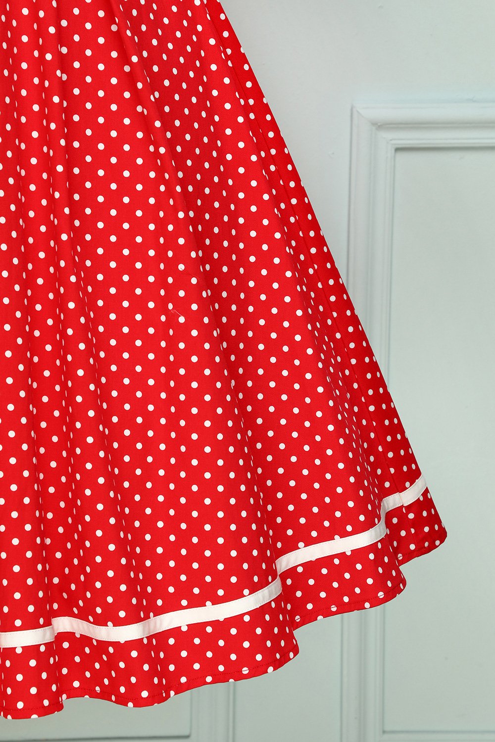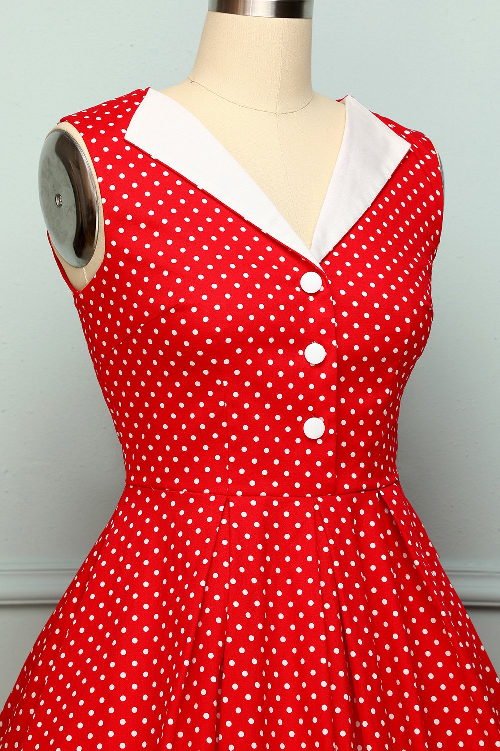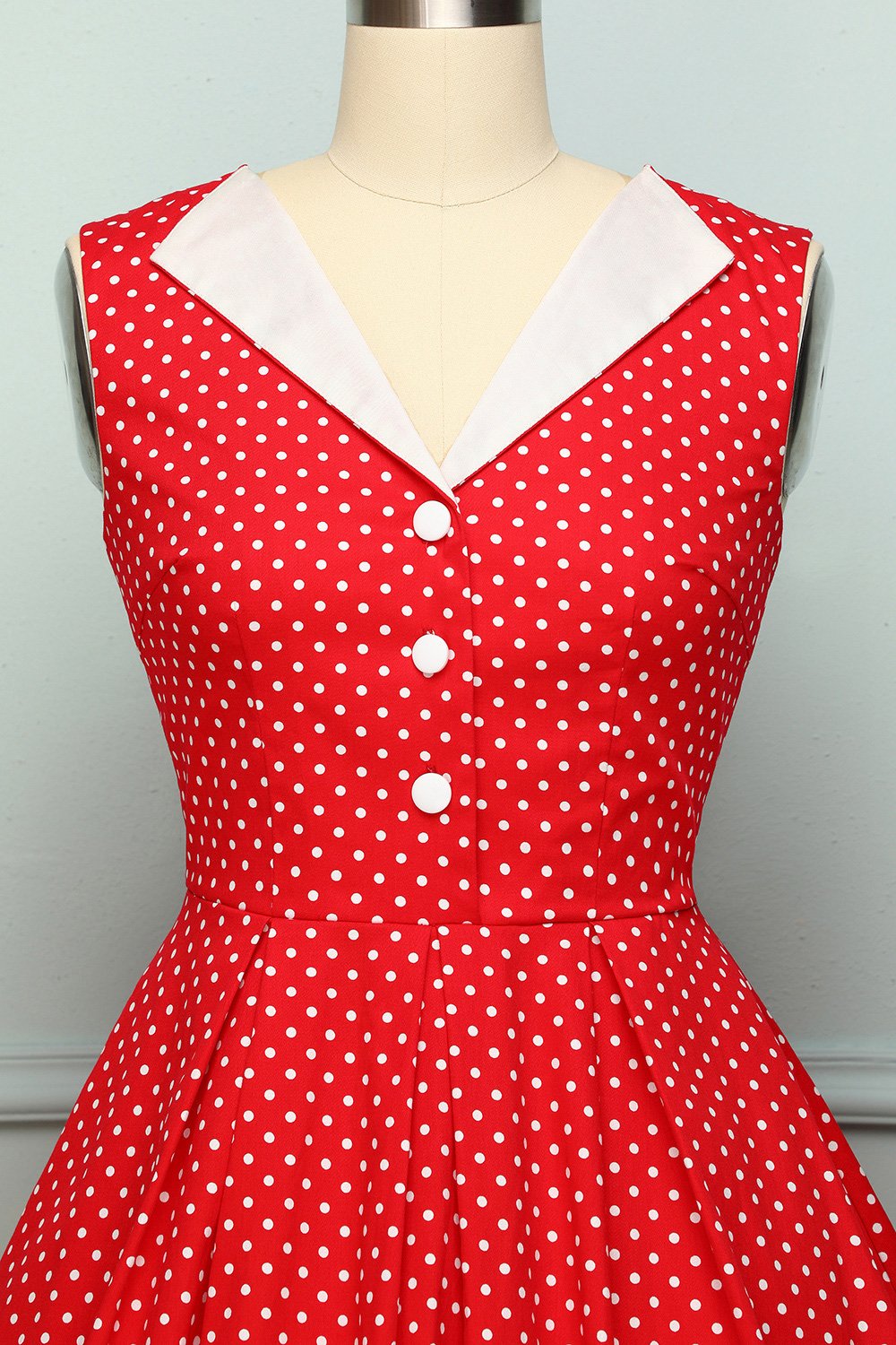 An A-line red vintage polka dot dress is for a semi-casual look. The top part is designed with lapel collar combined with V-neck cut. The buttons are hearted shaped to elevate feminine touch along with an embellishment of frills on the center. The white polka dots is perfect for a casual summer look. The 1950s swing dress is a combination of semi-formal and feminine style.
