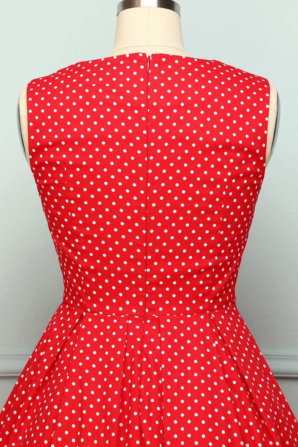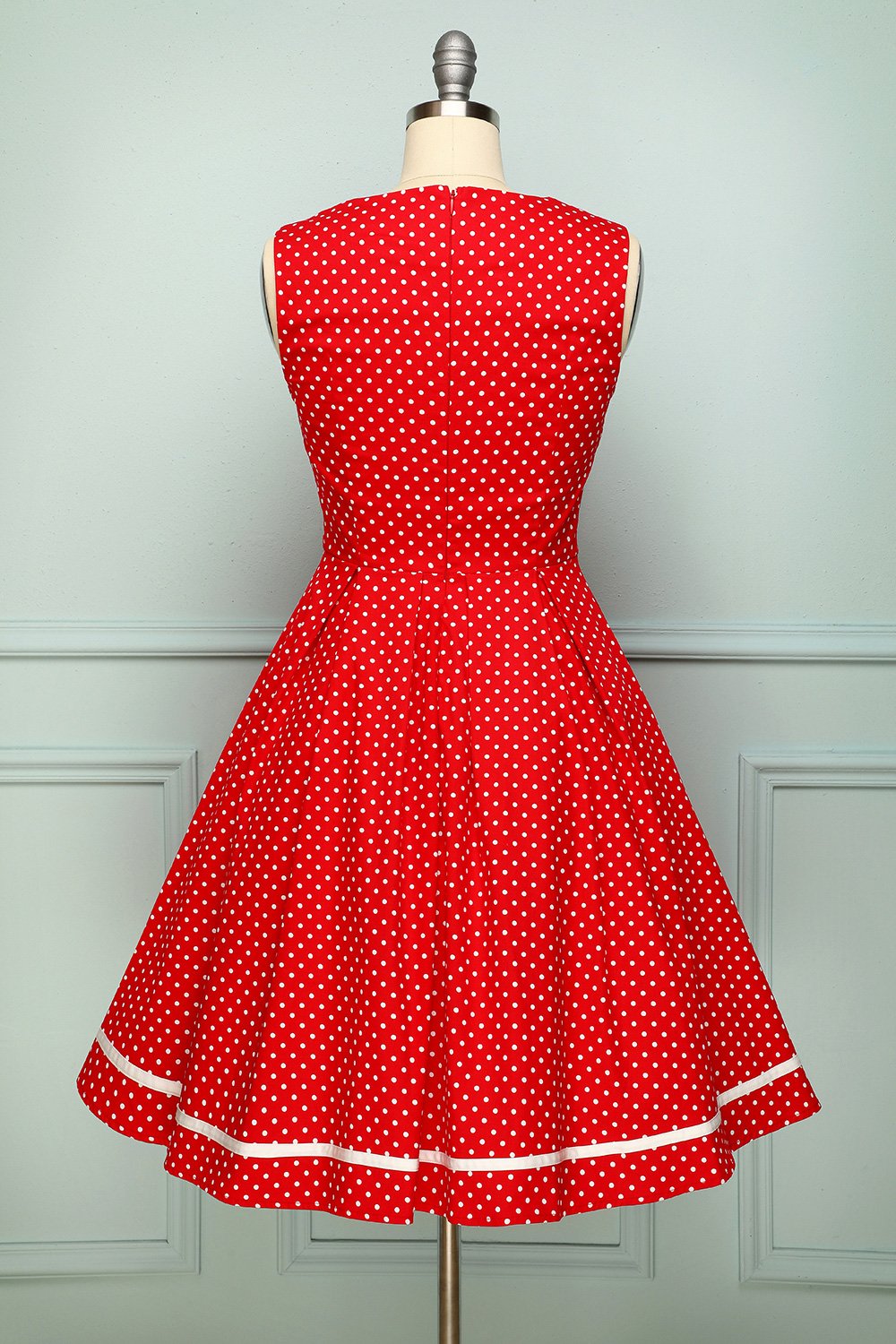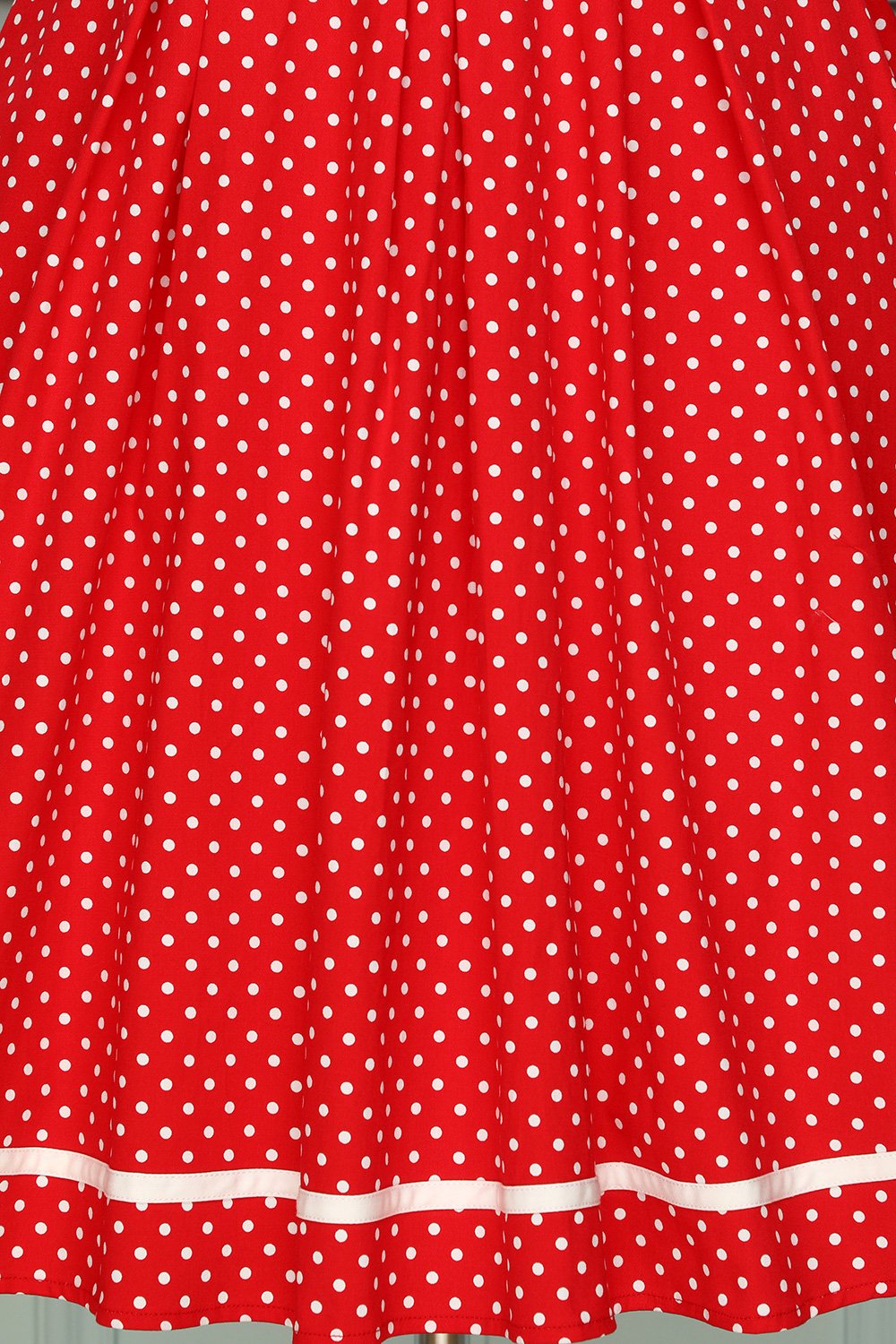 An A-line red vintage polka dot dress is for a semi-casual look. The top part is designed with lapel collar combined with V-neck cut. The buttons are hearted shaped to elevate feminine touch along with an embellishment of frills on the center. The white polka dots is perfect for a casual summer look. The 1950s swing dress is a combination of semi-formal and feminine style.
